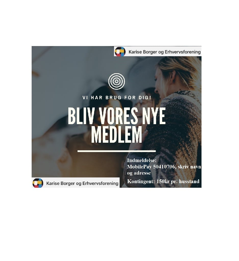 Meld dig ind i Karise Borger og Erhvervsforening – medlemskab 150 kr. årligt pr husstand.