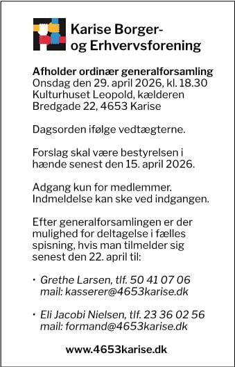 Eller formand Eli Jacobi Nielsen, formand@4653karise.dk